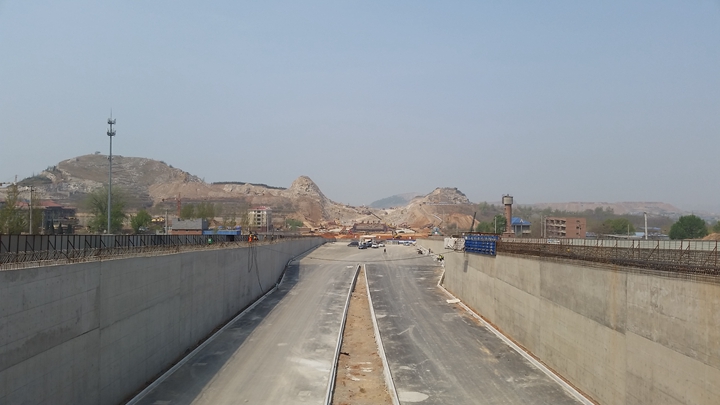 道路工程起于文莊路,地塹部分左線ZK0+725-ZK0+886.65,全長(zhǎng)161.65m,右線YK0+725-YK0+887.65,全長(zhǎng)162.65m。地上部分北側(cè)BK1+375-BK2+025,全長(zhǎng)650m,南側(cè)NK0+425-NK1+075,全長(zhǎng)650m。道路橫斷面為:4米人行道+3.5米非機(jī)動(dòng)車道+3.0米綠化帶+14.75米機(jī)動(dòng)車道+13.75機(jī)動(dòng)車道+13.75機(jī)動(dòng)車道+14.75米機(jī)動(dòng)車道+3.0米綠化帶+3.5米非機(jī)動(dòng)車道+4米人行道。