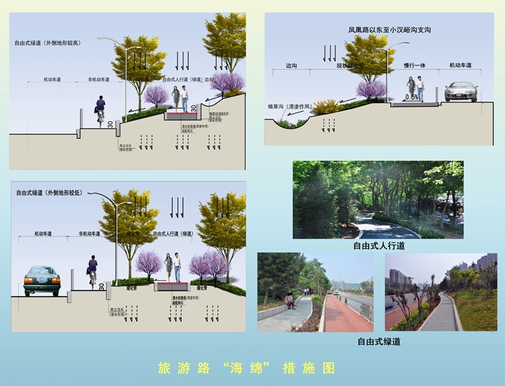 生態(tài)水塘下鋪設(shè)了60cm碎石促滲層,既加速了雨水下滲,同時也提高了蓄水能力。生態(tài)水塘內(nèi)種植了蘆葦、菖蒲、千屈菜、花葉蘆竹等水生植物,橋臺護坡進行了疊石壘砌樹池處理,種植了木槿、紫薇等花灌木,改變了原來石砌護坡裸露的灰色形象。通過實施一系列海綿設(shè)施改造建設(shè),不僅大大緩解了旅游路雨水系統(tǒng)壓力,而且極大改善了該區(qū)域生態(tài)景觀環(huán)境,實現(xiàn)了工程建設(shè)綜合效益提升。