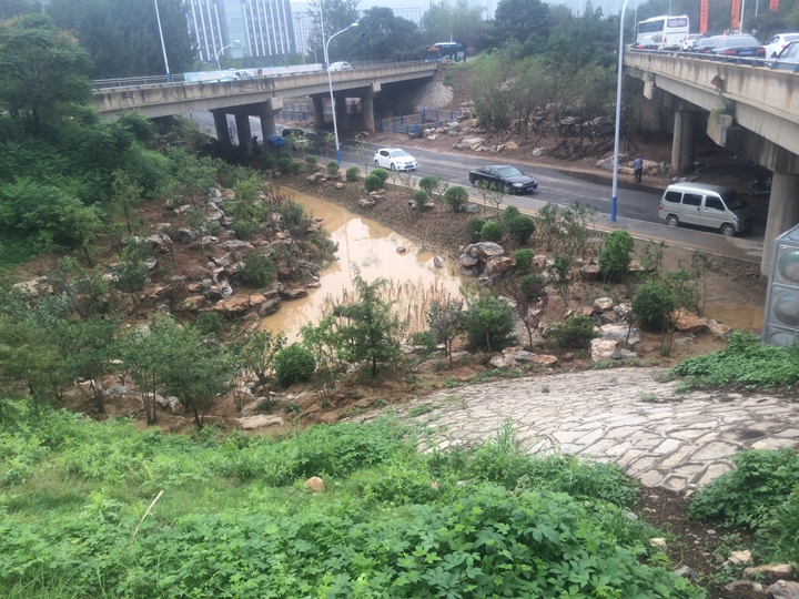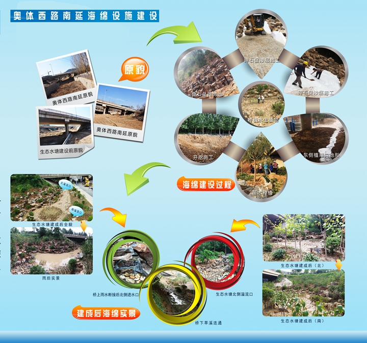 奧體西路南延原為斷頭路,道路紅線范圍及東西側(cè)空間原狀均為荒地,旅游路北橋北側(cè)原為大辛河支溝上游河道。結(jié)合本次奧體西路南延道路工程建設(shè),充分落實海綿城市建設(shè)理念,重點對橋下空間因地制宜進行挖潛,精心設(shè)計建設(shè)了1500余平方的生態(tài)水塘、植草溝、旱溪等海綿工程設(shè)施。通過對旅游路部分路段雨水進行斷接,使上游區(qū)域雨水先進入生態(tài)水塘等設(shè)施進行生態(tài)凈化和下滲,滲后多余的雨水再溢流進入大辛河支溝,徹底改變了該路段原有的雨水直排模式。