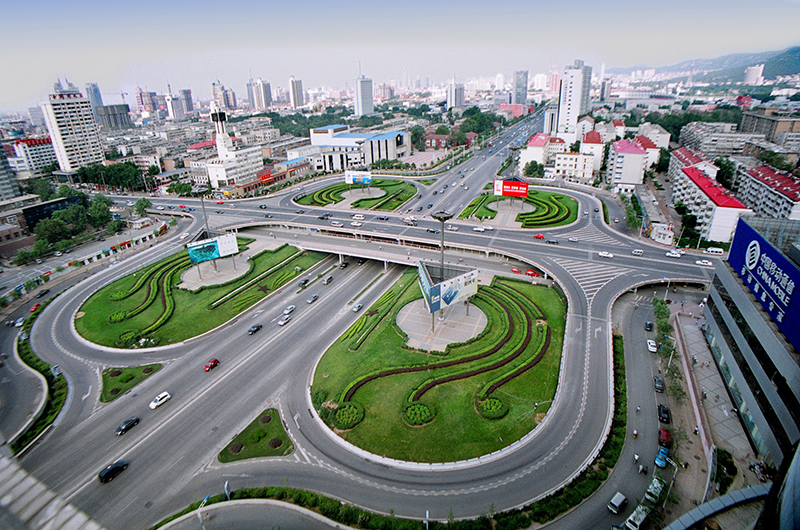為苜蓿葉形三層互通式立交,兩條主干路均寬 50 米,橋梁上部采用簡支箱梁,寬腹 T 梁及三孔連續(xù)板結(jié)構(gòu),預(yù)制安裝,施工簡單;下部蓋梁為暗藏式,墩身采用蝙蝠式柱,外形美觀;基礎(chǔ)為鋼筋砼擴大基礎(chǔ)及灌注樁;該立交充分利用原有排水系統(tǒng),雨污水完全自流,經(jīng)濟合理。榮獲市長金杯獎,被評為泉城十大景觀之首。
