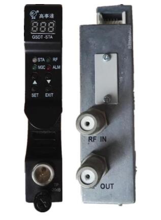 GSDT-AMP為頭端或分前端正向射頻放大模塊,運(yùn)用射頻放大電路可提供高線性、低噪聲和低失真的特性。通過前面板控制,可以調(diào)節(jié)輸出射頻信號(hào),從而得到信號(hào)的輸出電平值。由于纜線的信號(hào)損耗,造成高低頻信號(hào)不平,可以通過前面板控制輸出斜率,調(diào)平信號(hào)。